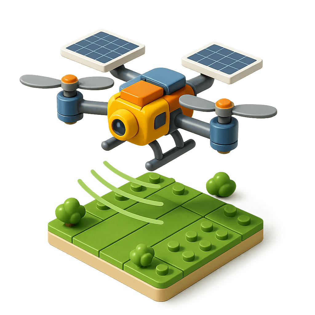 A small LEGO-style drone floating on water, equipped with a net scooping up plastic waste and debris.